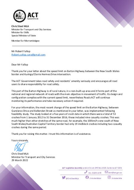 On 29 March, Minister Steel responded to the request advising that this part of the Barton Highway is of rural nature, in a non-built-up area and it forms part of the national and regional network of roads with the main objective in movement of traffic. Its design and configuration complies with the current speed limit, nevertheless Roads ACT will continue monitoring its performance and take necessary action if required.